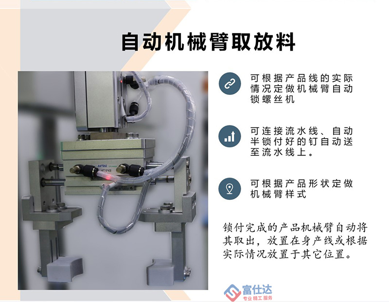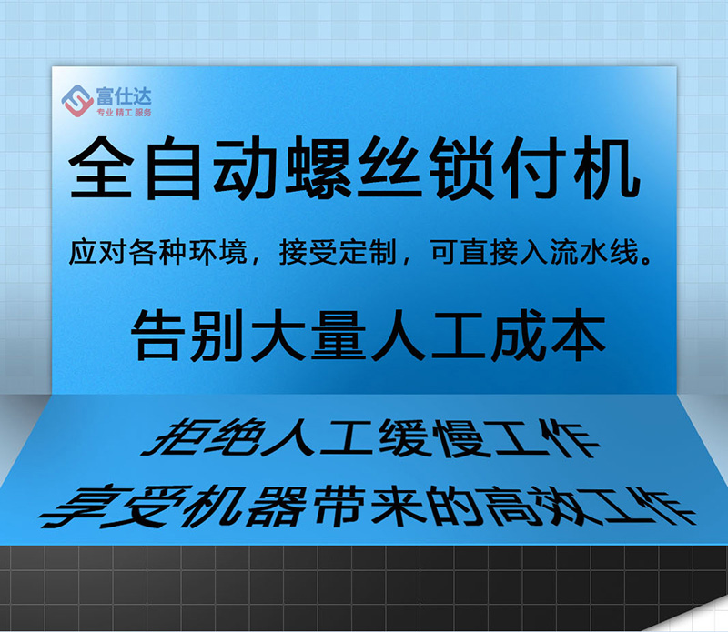 富仕達擁有獨立研發(fā)設(shè)計團隊600多位自動化高級工程師,5000㎡自動鎖螺絲機生產(chǎn)、測試車間,專業(yè)售后服務(wù)團隊,為客戶提供方案設(shè)計、設(shè)備制造、操作培訓、售后服務(wù)等一站式服務(wù)。 公司將持續(xù)提升技術(shù)創(chuàng)新和產(chǎn)品服務(wù)方面的優(yōu)勢,堅持“專業(yè)、精工、服務(wù)”的企業(yè)理念,聚焦于自動鎖螺絲設(shè)備生產(chǎn),通過系統(tǒng)的一站式解決方案,真正的幫助客戶提升效率、降低成本,提升客戶的核心競爭力。