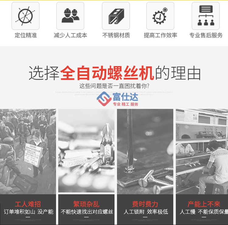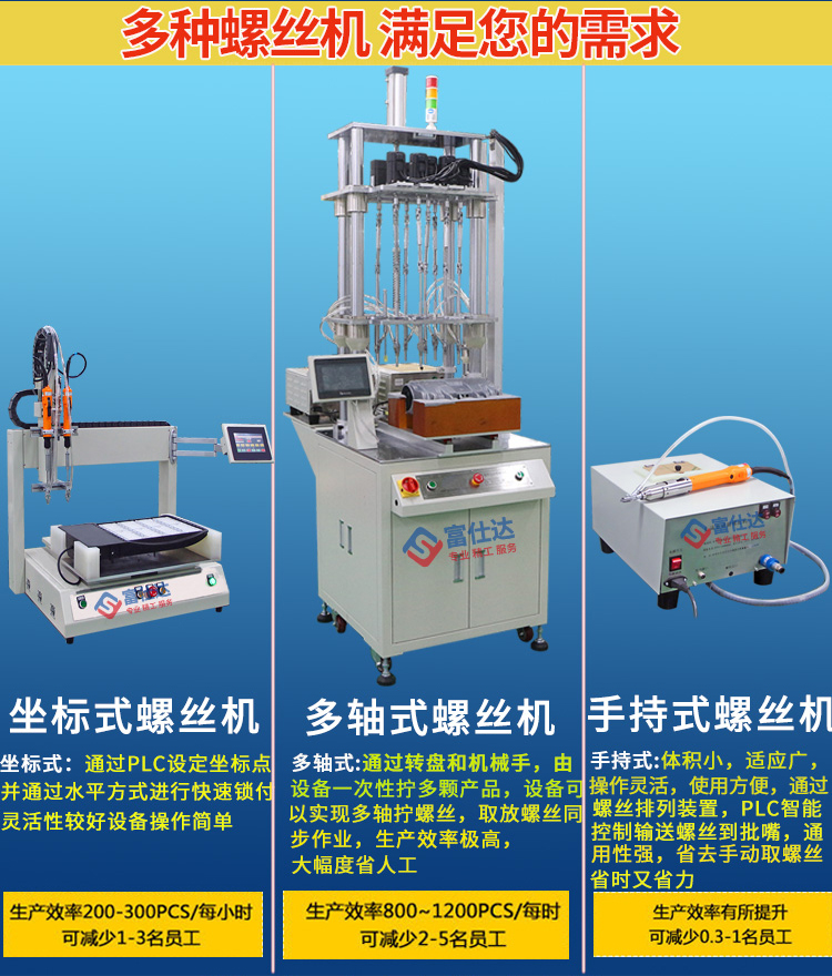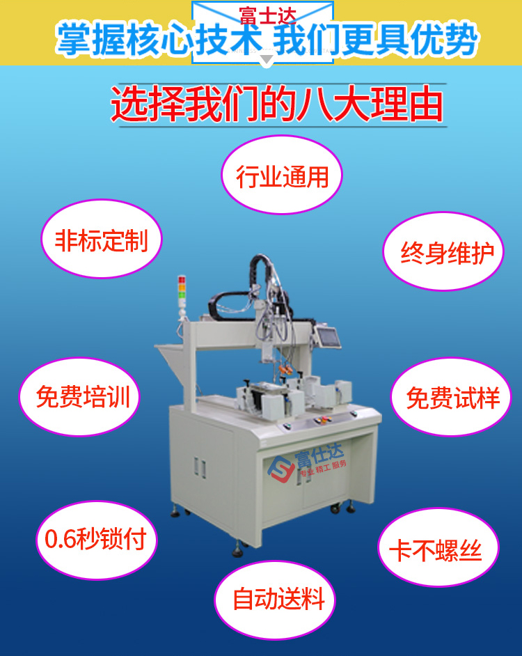 深圳市富仕達自動化設備有限公司是國內領先的以自動鎖螺絲設備為核心的自動化設備制造商,堅持以客戶需求為中心,定制自動化鎖螺絲方案,已有超過9000家企業(yè)采用富仕達定制的自動鎖螺絲設備實現“機器換人”,節(jié)省大量人力成本。