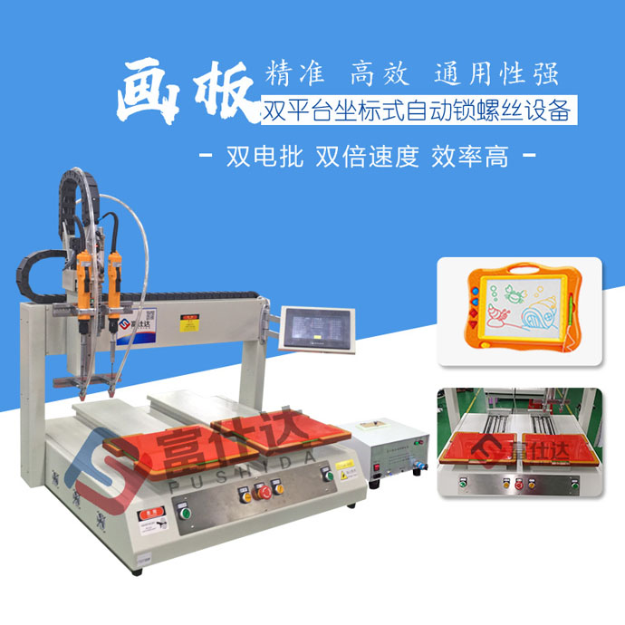 兒童畫板自動鎖螺絲機采用富仕達雙平臺坐標式,配置2把電批一次同時擰好2顆螺絲,效率提升2倍,設(shè)計可調(diào)式夾具,滿足多產(chǎn)品生產(chǎn)要求。